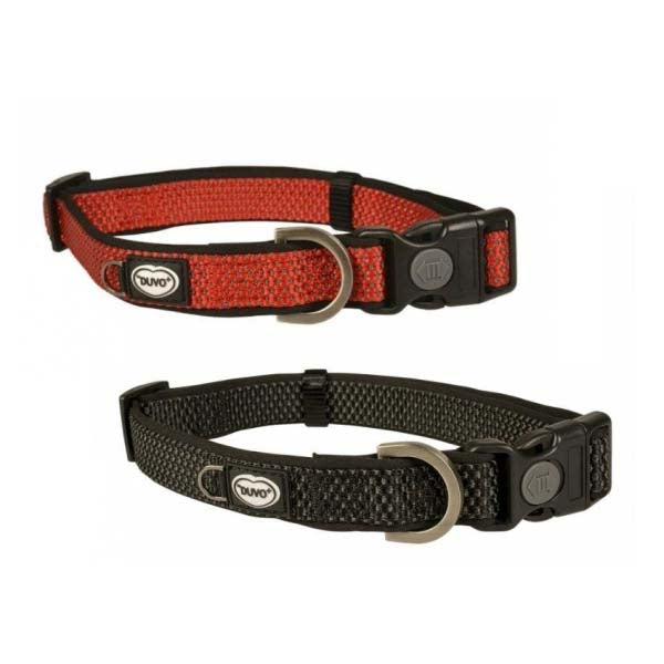 Paleta proizvoda Duvo + EXPLOR EAST je asortiman tvrde završne obrade, otporan na vremenske uslove, udobnih materijala izrađenih od dvobojnog najlona u klasičnim bojama. Završna obrada uključuje snažne metalne prstenove i kopče u brušenom metalu "Graphite Grey", koji se mogu prilagoditi vašem psu savršeno i vrlo su jednostavni za korišćenje. Klik zatvarači imaju klizno zaključavanje, a remeni imaju fluorescentne delove za vidljivost u mraku.