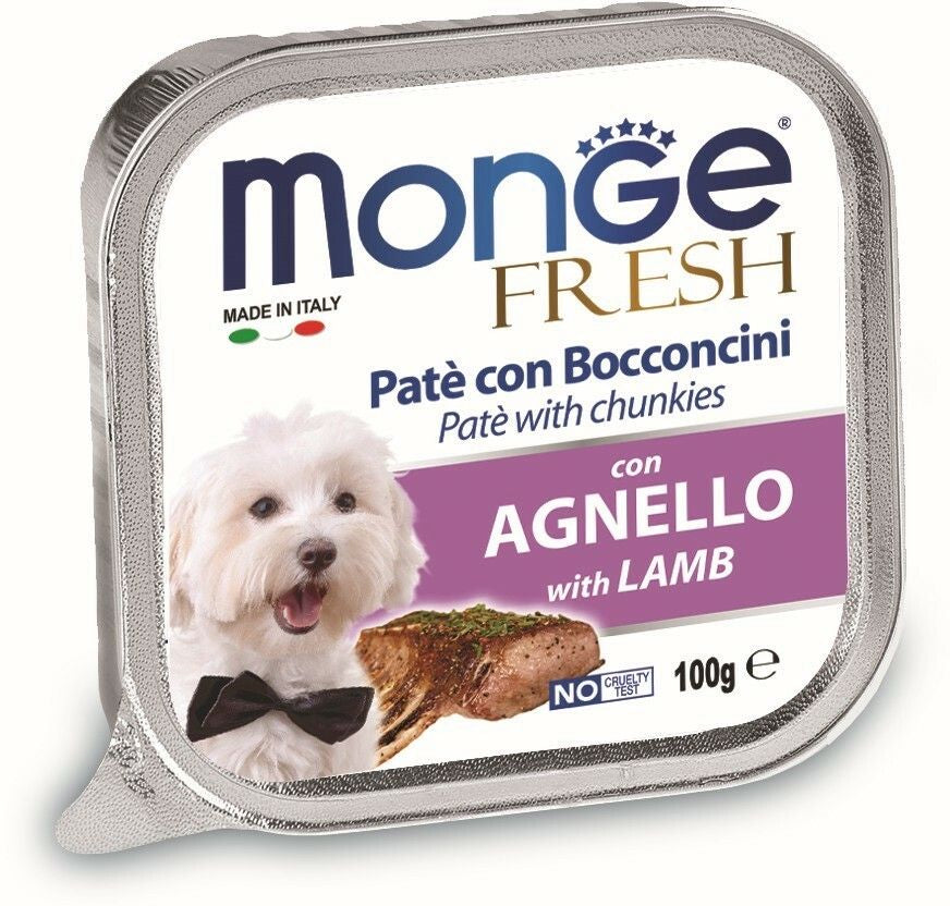 Ukusna pašteta sa svežom jagnjetinom je kompletna hrana odabrana da svakodnevno podržava dobrobit vašeg ljubimca. Recept je formulisan sa niskim sadržajem šec´era i bez hidrogenizovanih masti. Mekana i ukusna pašteta sa komadic´ima je idealna za male pse i kao poslastica za vec´e pse. Monge Fresh je proizveden u Italiji, nije testirano na životinjama i bez veštackih boja i konzervansa.