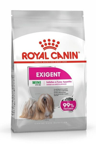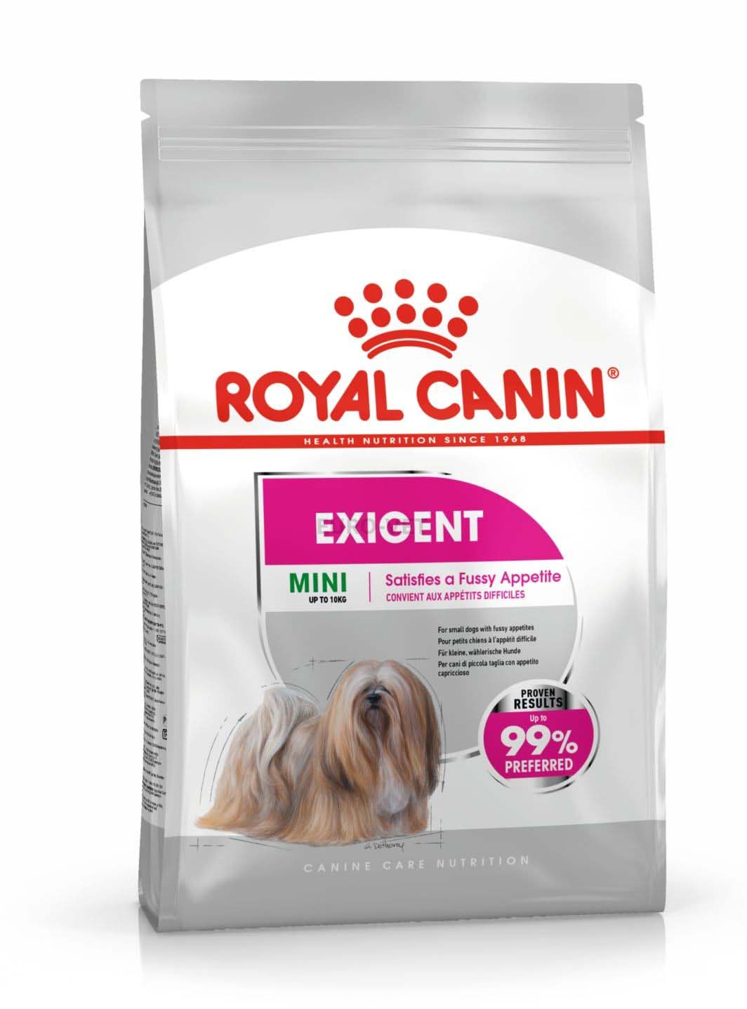 Size Health Nutrition Mini Exigent je ekskluzivna formula za pse malih rasa sa izbirljivim apetitom i visoko aktivni, razigrani i troše puno energije. Potrebna im je pažljivo odabrana odgovarajuća ishrana sa izbalansiranim sastojcima i visokokvalitetnim proteinima (30%). Zahvaljujući L-karnitinu koji stimuliše metabolizam masti osigurava se održavanje idealne telesne težine. Krzno dobija mekoću i sjaj dejstvom EPA-DHA masnih kiselina i vitamina. Natrijum-polifosfat pomaže u redukciji formiranja zubnog kamenca "vezivanjem" kalcijuma iz pljuvačke te se on ne odlaže u zubni plak. Posebna tekstura, oblik i veličina granule selekcijom prirodnih ukusa zadovoljava prohteve i najizbirljivijih pasa.